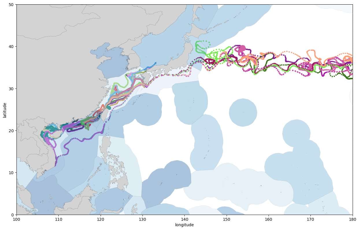 Our work builds on other exciting research projects happening in ATLANTIS, most importantly the ocean plastic fate model developed by Marte et al. (link) and the MarInvaders database developed by Philip and his collaborators (link). The plastic fates, or trajectories of plastic debris items through the ocean, serve as the fundamental unit of the model. For each plastic item, we model how the community develops over time. This includes colonization rates, local die-off rates, and of course, dispersal rates of the “rafting” species in new ecosystems. When we do this for hundreds of possible plastic fates at the same time, we begin to understand how these floating plastic debris items may pick up and drop off alien species in any given coastal ecosystem worldwide.